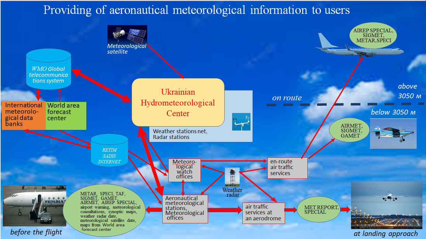 - from the meteorological watch offices of UkSATSE - arial forecasts for low-lewel flights (from the surface of the earth to the height of 3050 m) GAMET, SIGMET, AIRMET, AIREP SPECIAL information for the territory of Ukraine;