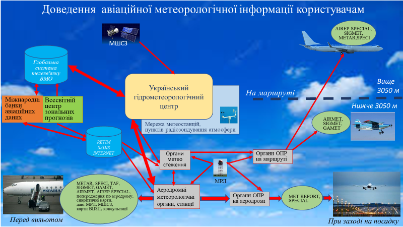- від органів метеорологічного стеження Украероруху – зональні прогнози для польотів на низьких рівнях (від поверхні землі до висоти 3050 м) GAMET, інформацію SIGMET, AIRMET, AIREP SPECIAL для території України;